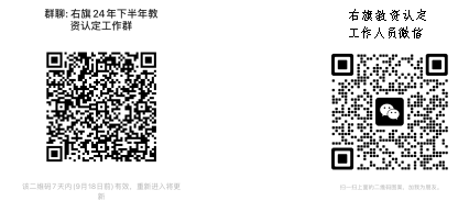 注意:所有申请人请添加“右旗24年下半年教资认定工作群”,其他事宜请关注群里通知。未能在有效期内加入群的请加教资认定工作人员微信,加群或微信请在备注里写:右旗教资认定;