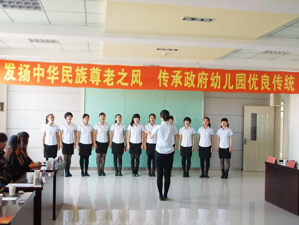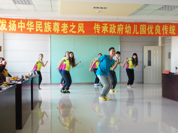 为发扬中华尊老之风,传承老一辈的优良传统,做新时代的幼儿教师。青年教师们为退休的老人们表演了唱歌、舞蹈。茶话会结束后退休的老人们参观了幼儿园。