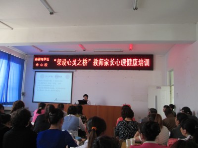 郝老师主要从给教师心灵减压,如何克服教师的职业倦怠,如何识别有心理健康问题的学生,教师、学生、家长三者之间的心理沟通技巧四个方面来为全体教师和学生家长代表进行心理健康专题培训。