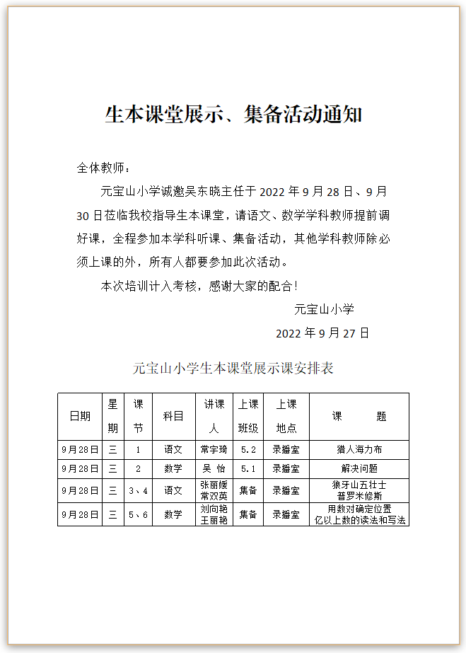在“双减”政策全面推进之际,为充分发挥课堂教学主阵地作用,促进教育教学提质增效,让“双减”政策落地生根,打造高效、自主、灵动的生本课堂教学模式,提高教师课堂教学质量,加强教师之间的学习交流,展示生本教育改革课题研究以来课堂教学发展的新变化。2022年9月28日和9月30日,元宝山小学特邀知名教育专家吴东晓莅临指导“双减”背景下的生本课堂教学。