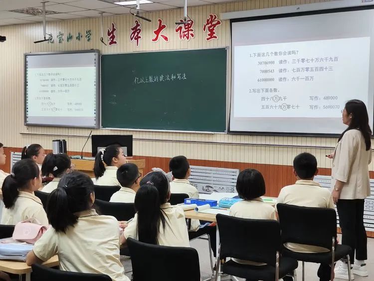 王丽艳老师执教《亿以上数的读法和写法》。王老师根据学生的实际运用了迁移的教学方式。让学生有时间、有空间把自己掌握的亿以内数的读、写的方法和经验迁移类推到亿以上数的读写上来。本堂课老师是组织者、引导者、合作者,学生们成为了学习的真正主人。