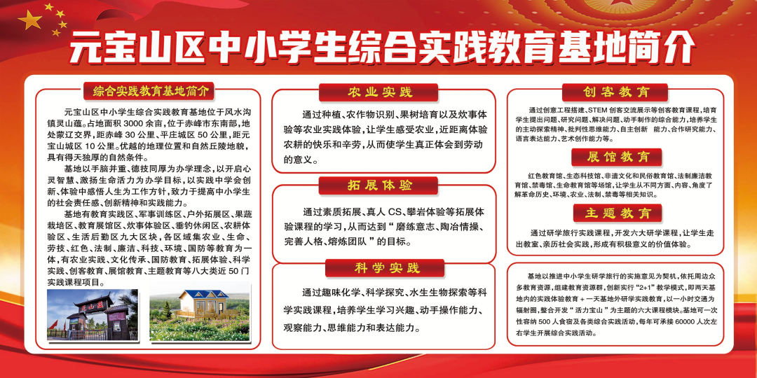 基地由元宝山区青少年活动中心负责监管,以开启心灵智慧、激扬生命活力为办学目标,以在实践中学会创新、体验中感悟人生为工作方针,提高中小学生的社会责任感、创新精神和实践能力是中心、学校、基地三方共同的努力方向。