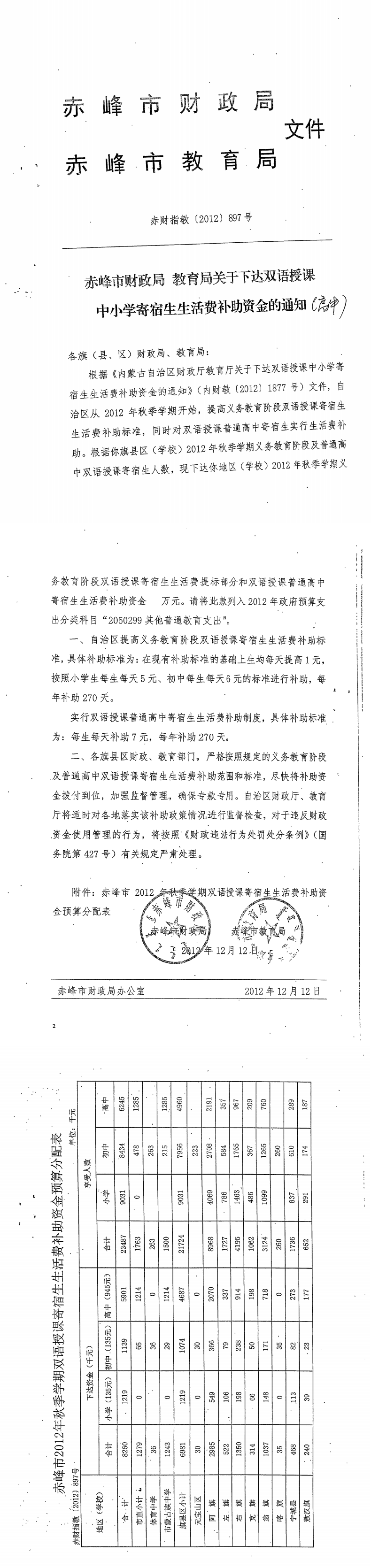 赤峰市财政局 教育局关于下达双语授课中小学寄宿生生活费补助资金的通知(赤财指教[2012]897号)