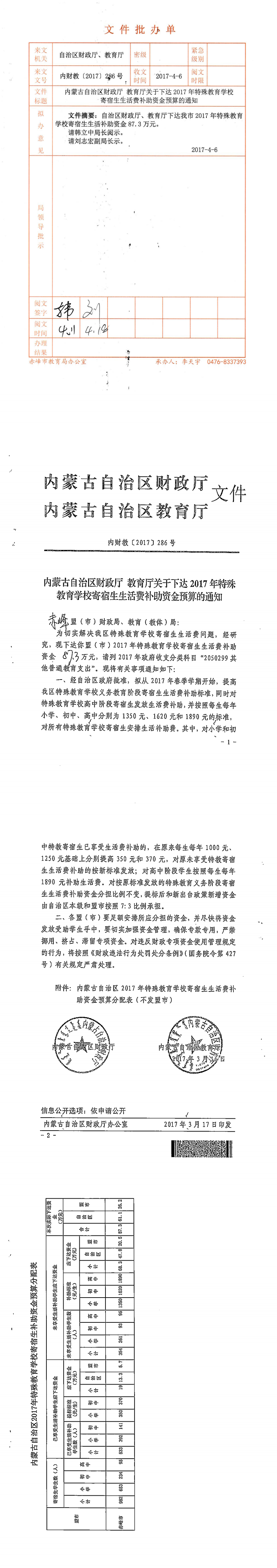 关于下达2017年特殊教育学校寄宿生生活补助资金预算的通知(内财教〔2017〕286号)